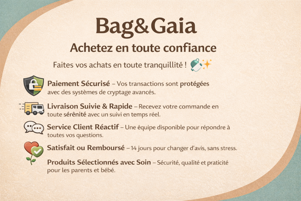 Chez Bag & Gaia, nous accompagnons les parents dans chaque moment précieux avec bébé. Notre sélection de sacs à langer, porte-bébés et accessoires pratiques allie design, confort et fonctionnalité pour un quotidien plus serein.